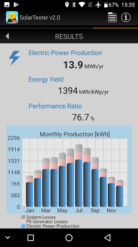 - Biedt een snelle schatting van: jaarlijkse/maandelijkse elektriciteitsopwekking, optimale kantel-/azimuthoek, terugverdientijd, gemiddelde elektriciteitskosten en nog veel meer...