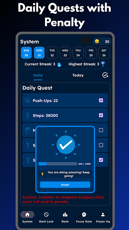 Introducing Solo X Player Leveling Workout! Your personal leveling system is in your hands! With this leveller, transform your daily routine into an epic adventure. Block distractions, use our pomodoro timer, complete quests to earn XP and unlock rewards, and compete globally. Level up your productivity and join a community of achievers. Download now!