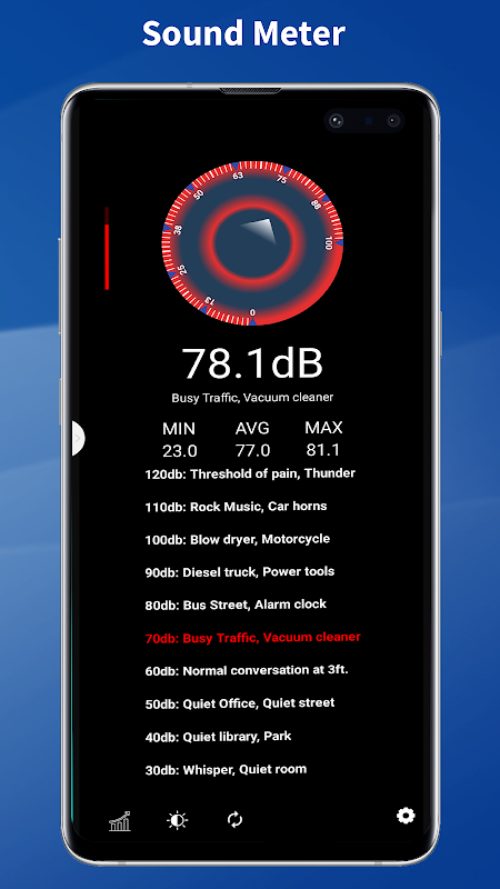Sound detector and noise meter uses the phone built-in microphone for measuring the volume of sound in decibels(dB) and the graph is used to show the continuous changes in measuring the sound and noise.