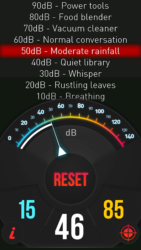 Het gemeten geluidsniveau wordt weergegeven met behulp van een indicator op de meter. Het geluidsniveau varieert tussen 0 en 140 dB. Naast de live geluidsmeting geeft de applicatie ook het minimale en maximale geregistreerde geluidsniveau weer. U kunt dit op elk moment wissen met de "Reset"-knop.