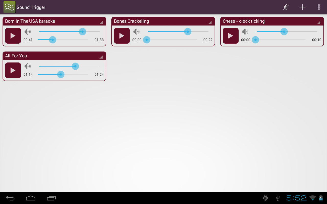 To create a trigger, choose an audio file that is stored on your phone or tablet. The trigger is shown on the main screen with a large button that starts and stops playback. Each trigger has the following properties: