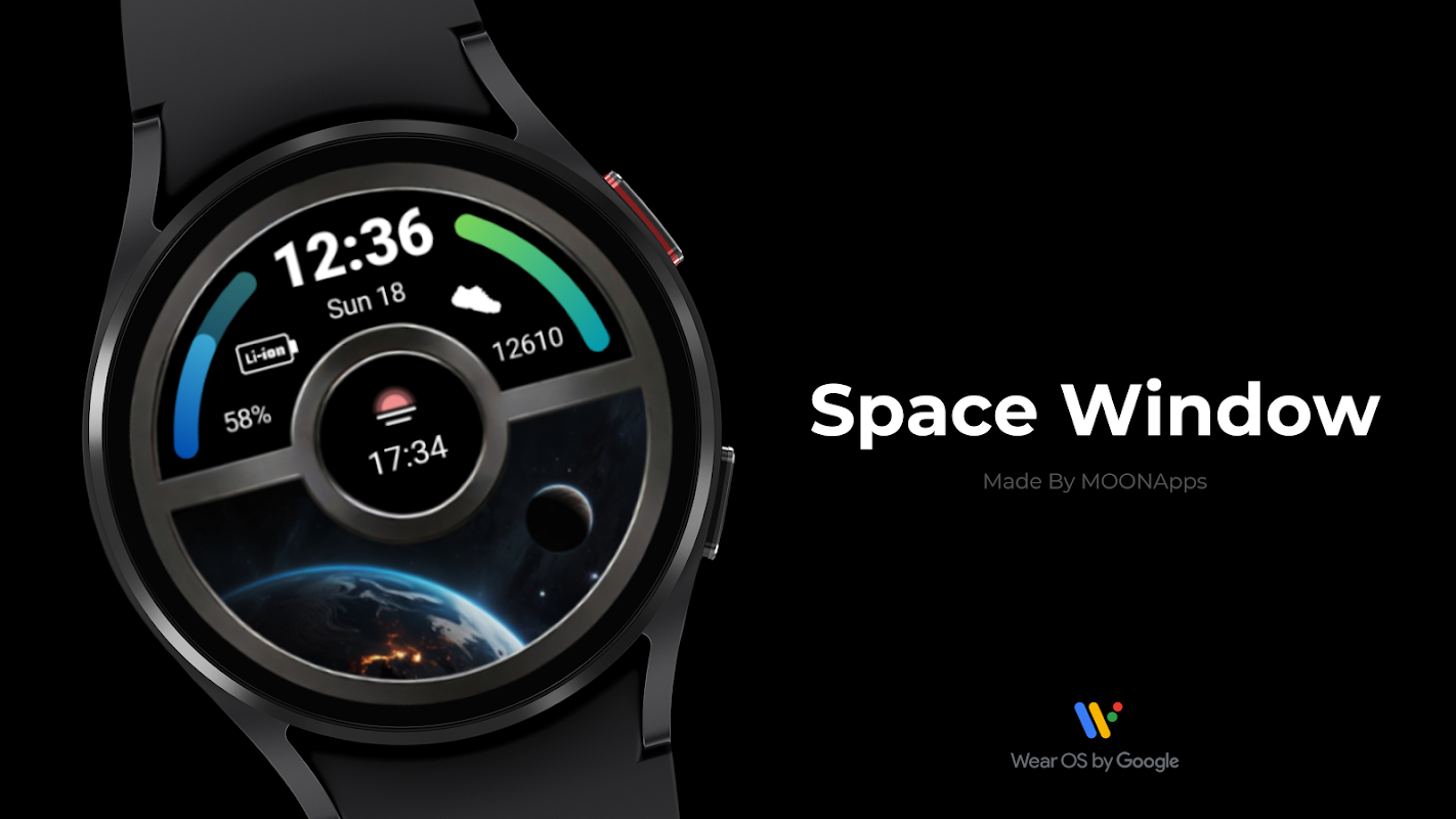 Space Window - Een wijzerplaat met ruimtethema voor Wear OS-apparaten.