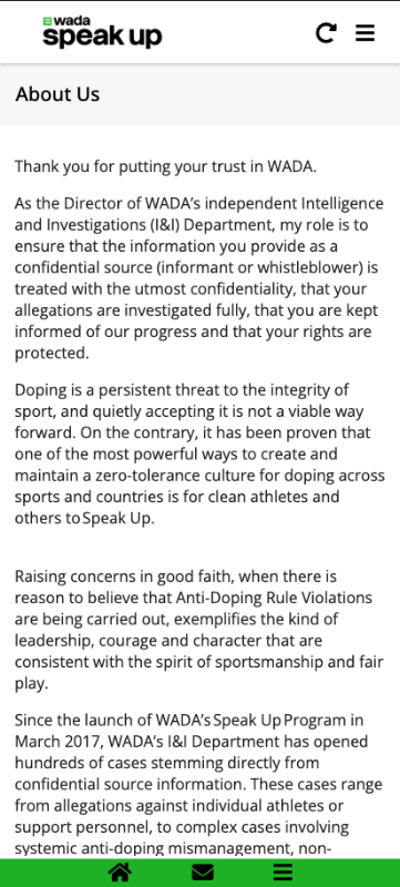 Speak Up! app biedt een veilige en vertrouwelijke manier om doping overtredingen te melden in de sport. Het wordt beheerd door de Inlichtingen- en Investigations Team tijdens de World Anti-Doping Agency (WADA). Dit team werkt zelfstandig binnen het WADA om de vertrouwelijkheid te waarborgen.
