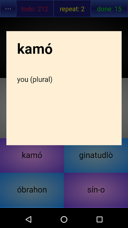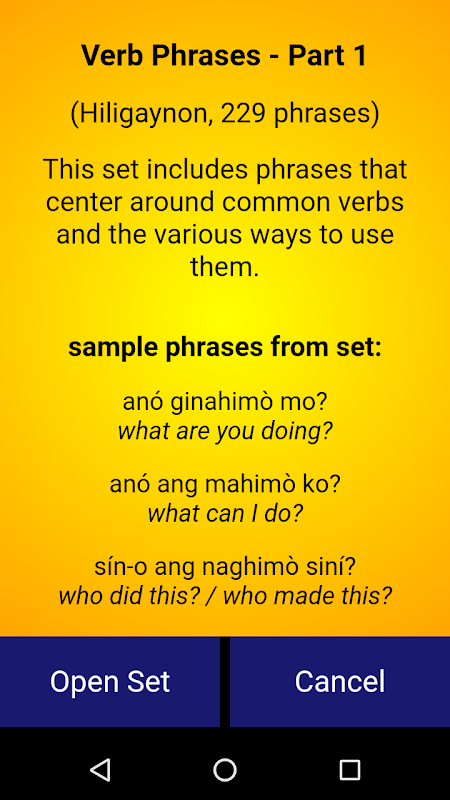 Met de app kunnen gebruikers elke zin met vallen en opstaan leren. Ze krijgen een Engelse vertaling te zien en krijgen de opdracht om de bijbehorende Ilonggo-zin woord voor woord op te bouwen. Als ze een fout maken, wordt de zin automatisch op een 'herhaal'-stapel gelegd en krijgen ze enige tijd later nog een kans om het opnieuw te proberen totdat ze het goed hebben.