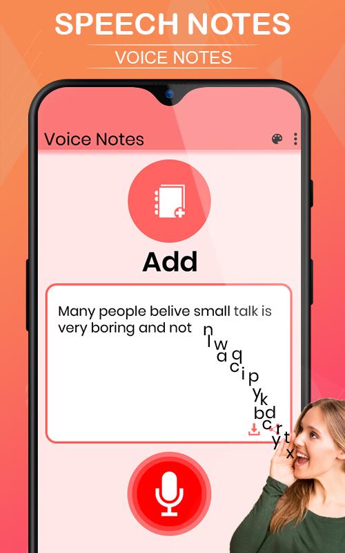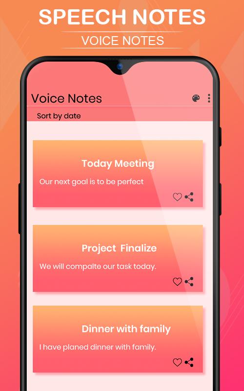 Voice Notes Converter You can select a color scheme to suit your tastes in the settings. The app comes with a large number to select from. There is even a black-and-white theme for those who prefer a high-contrast interface. Speech Notes App Can export all of your notes to a machine-readable format or as plain text. Voice Notes Changer is all languages Voice Typing app, Speech Notes can be used as Voice notes using this you won't need any keyboard. You will just type with your voice. Hence it works as voice dictator. This amazing Speech Notes App can be used to save the voice typed text as Voice notes. These notes can be edited later.