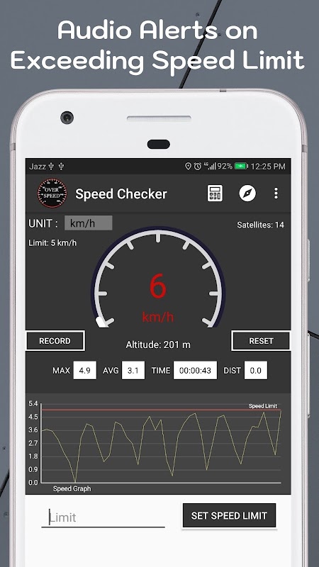De snelheidsmeter biedt ook een grafische weergave voor het analyseren van uw snelheidsmetergegevens. Deze grafiek of grafische weergave geeft de snelheid weer in seconden. In deze snelheids-app of in je snelheidsmeter kun je ook resetten met behulp van de resetknop. Deze knop zal de status resetten over de maximaal behaalde snelheid, gemiddelde snelheid en totale tijd die wordt genomen.