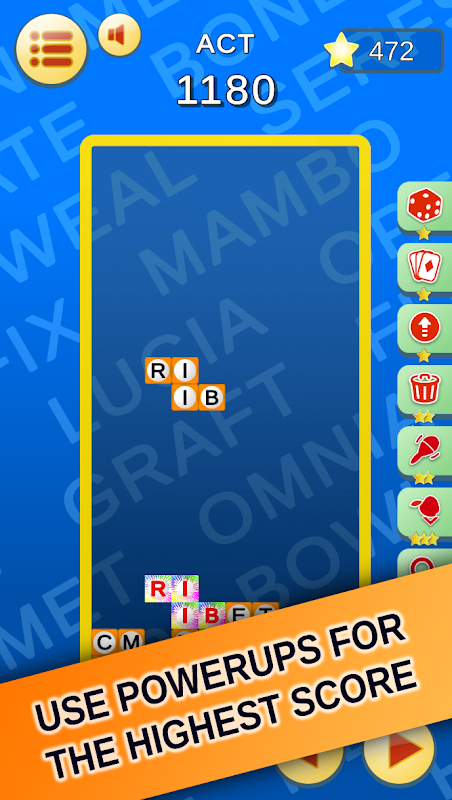 Bestuur willekeurig gegenereerde blokken om de container te vullen. Elke voltooide rij stenen wordt verwijderd en je krijgt 10 punten. Maar dat is niet alles, op elke steen staat een letter. Land blokken zodanig dat ze complete woorden vormen (horizontaal gelezen) en de hele rij met het woord wordt verwijderd, zelfs als deze onvolledig is. Je ontvangt ook bonuspunten voor elke letter, gebaseerd op hun zeldzaamheid! Behaal een maximale score, die u altijd kunt controleren op het Stats-bord.