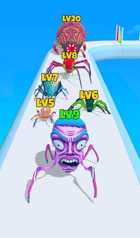Ga op reis als een kleine spin en probeer de machtigste van allemaal te worden in dit boeiende hyper-casual mobiele spel. In Spider Evolution Run begint je avontuur op een levendige atletiekbaan, waar elke stap een sprong is om een sterkere en grotere spin te worden.