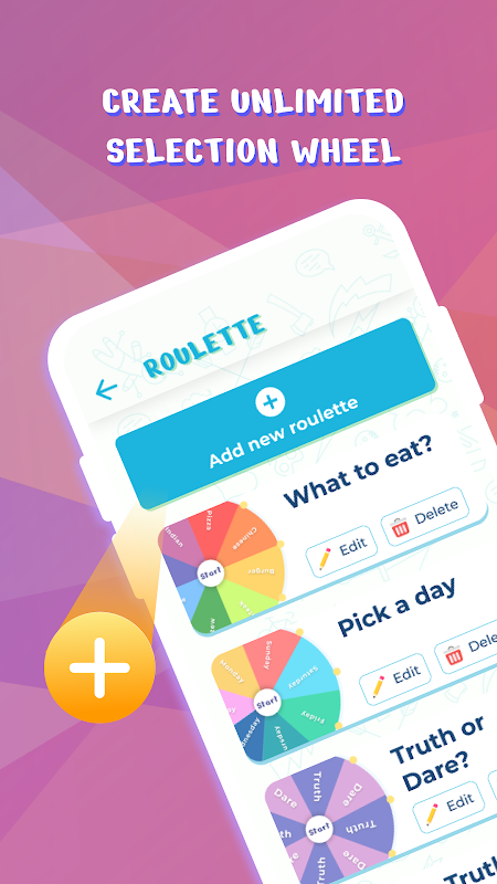Veel aangepaste wielen zoals Lucky Wheel, Color Wheel, Wheel of Fortune, generator voor willekeurige getallen en andere. Begin plezier te hebben en neem kleine beslissingen door aan het wiel te draaien.