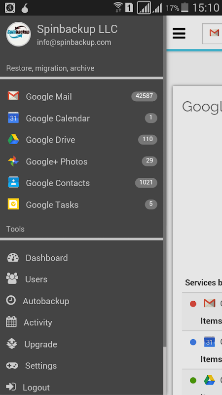 Spinbackup - Backup & Restore helps you to back up and restore Google Apps data such as Gmail, Google Drive, Google Calendar, Google Contacts, Google+ Photos and Google Tasks to an independent secure storage.