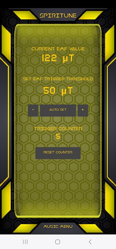 Start eenvoudigweg de app en plaats uw apparaat plat in het gebied dat u wilt onderzoeken. Noteer de huidige EMF-waarde en ga verder met het instellen van de drempelwaarde tot net boven de huidige waarde. Dit is uw triggerlimiet, dus als om welke reden dan ook de EMF-metingen stijgen boven deze drempel. De muziek wordt geactiveerd en afgespeeld zolang de meting boven de drempel ligt. Elke keer dat deze wordt geactiveerd, wordt de app toegevoegd aan de triggertelling, zodat u aantekeningen kunt maken van actuele gebeurtenissen.