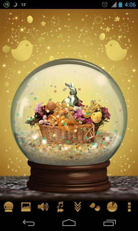 This beautiful "Spring Globe" has a number of cute items in a glass snow globe: easter eggs, easter bunny, easter basket with bow and more. App also includes lovely changeable backgrounds: bright meadow with blue sky, green grass with beautiful flowers, outdoor scenic nature with whimsical shapes, different attractive easter background designs and spring season scenery.