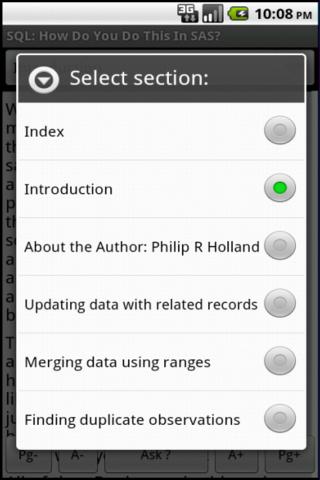 Deze app, "SQL:? How Do You Do This In SAS", is een van een reeks van eBooks over SAS programmeren van software gericht op de meest gestelde vragen en antwoorden over SQL, geïllustreerd met voorbeelden van code die kan per e-mail direct vanaf de verzonden worden app. Het is ontworpen om gebruikers te stimuleren om vragen waarvan sommige zal worden opgenomen in toekomstige versies van de app bij te dragen. Er zijn controles op specifieke vragen te selecteren, gaat u naar de vorige of volgende vraag, verlagen of verhogen van het lettertype naar voorkeur van de gebruiker passen, en e-mails versturen vraagt antwoorden op vragen die nog niet in die versie van het eBook.