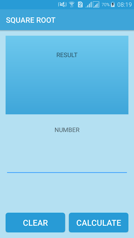 Deze applicatie kan de vierkantswortel van een getal te berekenen. Gehele getallen, decimale getallen worden ondersteund.