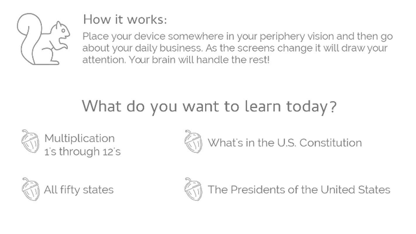 The idea is simple. Place this app within your periphery vision while doing other things. When the screen changes, like a dog being distracted by a squirrel, you will look at the screen. As you look your mind will passively begin to store the information.