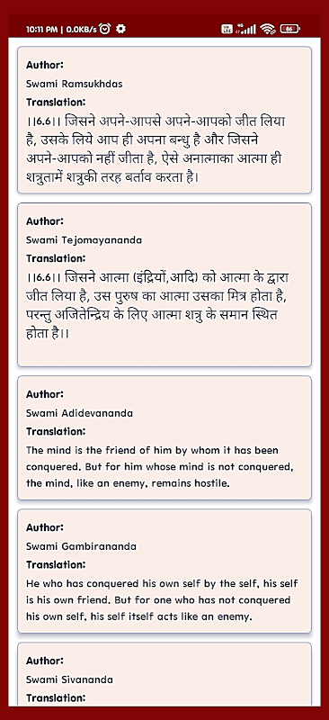 Lees en luister naar de Bhagavad Gita shlokas met de betekenis in het Hindi en Engels.