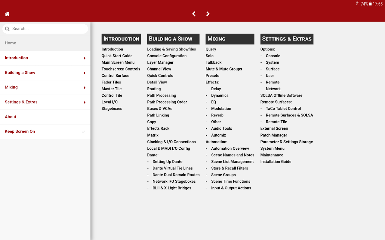 De SSL Live Help-app is een interactieve gids over het gebruik van de reeks Live-consoles van Solid State Logic, waaronder L100, L200, L350 en L550.