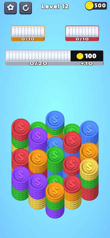 Welkom bij Stack Sort Puzzle, een leuke puzzelgame waarin je stapels kleurrijke munten verzamelt en ordent om uitdagende taken te voltooien. Het is een unieke variant op klassieke matchgames: in plaats van drie munten bij elkaar te zoeken, moet je 10 munten van dezelfde kleur verzamelen om punten te scoren!