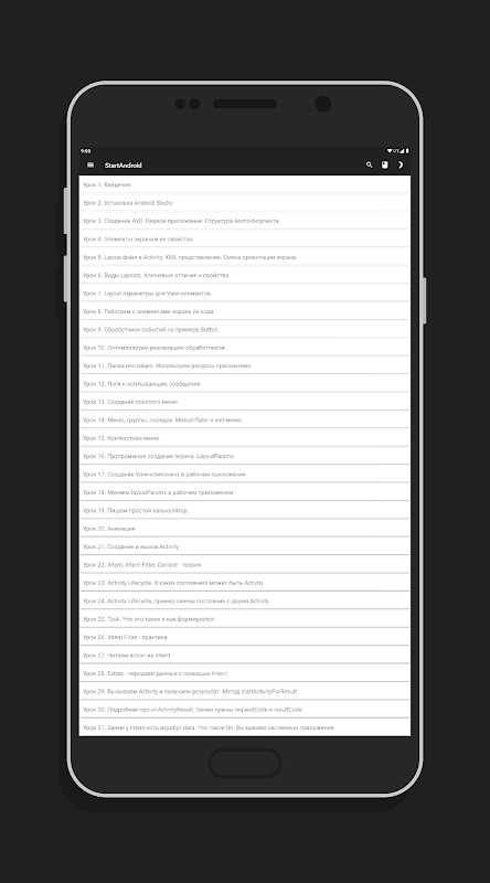 StartAndroid - programmeerlessen - dit is een uitstekend educatief programma dat basisinformatie over programmeren bevat. De gebruiker heeft toegang tot verschillende lessen, visuele voorbeelden, codefragmenten en andere details die helpen bij het leren van de programmeertechnieken. Informatie is onderverdeeld in categorieën en moeilijkheidsgraden, dus training zal geleidelijk plaatsvinden. De eigenaar van de gadget kan bladwijzers maken, de voltooide stappen markeren, het lettertype wijzigen, evenals het externe ontwerp van het programma. Dit alles maakt het werken met de applicatie uiterst eenvoudig. Al tijdens de ontwikkeling kan de gebruiker proberen iets te creëren, waardoor nieuwe kennis wordt versterkt.