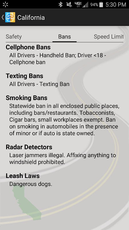 Op dit moment staat lijnen sporen meer dan 55 stuks van reizen relevante informatie voor elk van de 50 staten; zoals mobiele telefoon en texting verboden, veiligheidsgordel en kinderzitjes, staat omzetbelasting vrijstellingen, gas / diesel belastingen, fles deposito's, tijdzones, slepen & RV specifieke wetten, rustruimte 's nachts parkeren grenzen, state park camping entreegelden, standaardsnelheid limieten, radar detectoren, weg nood # s, de verkoop van alcohol wetten en belastingen, rookverboden, open container wetten, huisdier aangelijnd wetten, fietshelm wetten, motorfiets wetten (helm, verlichting, oogbescherming en lane sharing), links bochten op rood, u-bochten, rechts aanhouden en nog veel meer.