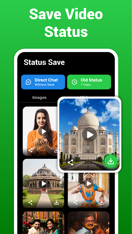 Met slechts één klik zorgt onze Video Status App-functie ervoor dat u nooit belangrijke updates van uw contacten mist. Bewaar en download statusupdates rechtstreeks naar de galerij van uw apparaat, zodat u gedenkwaardige momenten bewaart voor later plezier. Onze geïntegreerde Status Saver - Status Download-app biedt naadloze toegang tot statusvideo's, zodat u ze probleemloos kunt bekijken en downloaden.