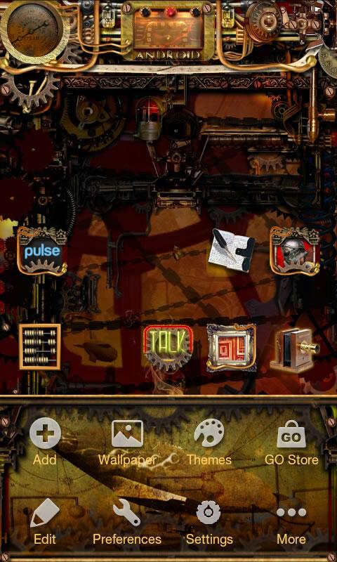 This Steampunk theme is for the Go Launcher Ex home replacement app. If you do not have it installed please download it from the market. Once you have installed Go Launcher Ex. Download this theme and install it. Press menu - themes - and select Steampunk.