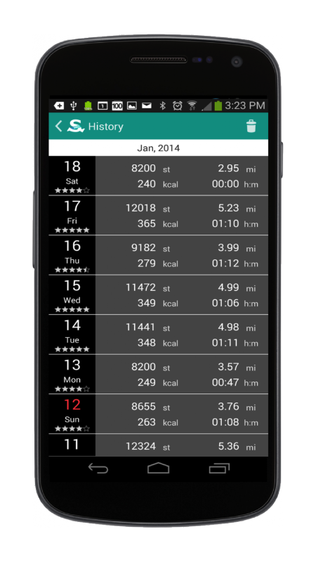 • Dagelijkse log geschiedenis : stap telt, verbrande calorieën, afstand en tijd
