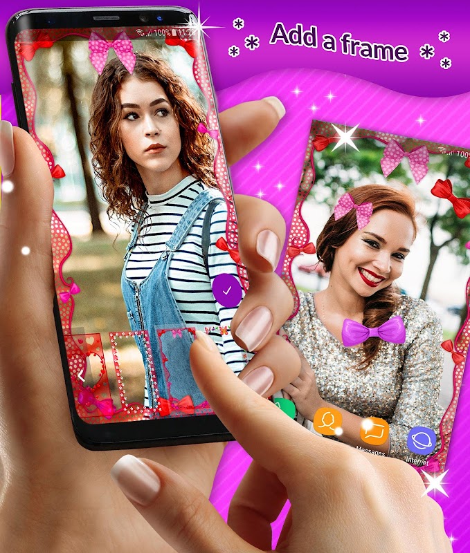Make your phone screen sparkle and shine with a variety of girly and pretty bows that you can place on you selfie or image, wherever you like!