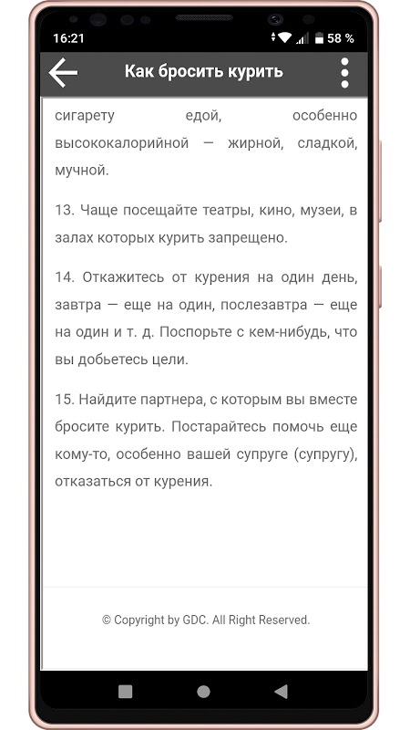 В нашем приложении Вы найдёте действенные и рабочие советы и методы для борьбы с курением. Многие курильщики говорили себе такие слова: бросаю курить, не курю, я бросил курить, но возвращались к вредной привычке. Информация, которую мы собрали для Вас, обладает феноменально сильным воздействием на ключевые центры зависимости. Как только Вы добьетесь победы над никотином, советуйте наше приложение своим знакомым и друзьям, будьте спасителем для их здоровья и жизни!