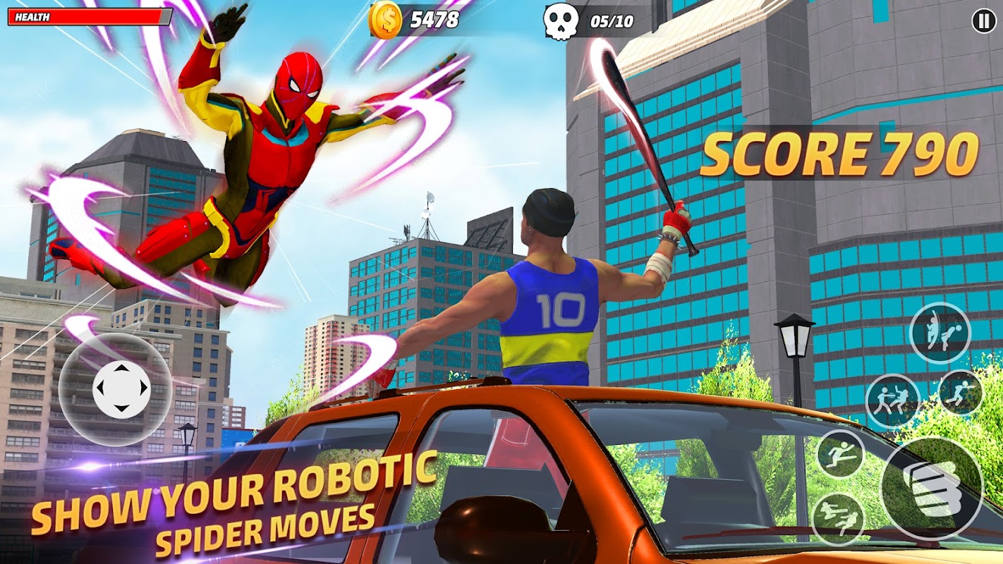 Sluit je aan bij vreemde spinrobotspellen en word een grote spinnentouwheld in spinspellen. Geniet gratis van de hoge snelheid van het vliegen met Spider Hero in superheldenreddingsmissie 2023.