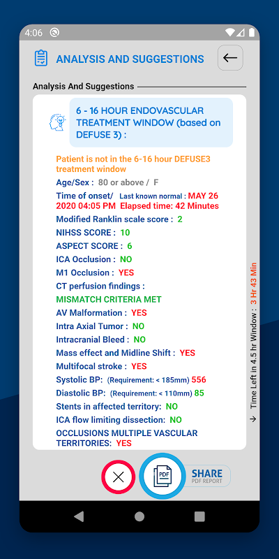 Als niet aan de criteria wordt voldaan, vermeldt het duidelijk de logica en de grondgedachte van WAAROM CRITERIA NIET ZIJN VERVULD en richt het zich opnieuw op het 4,5 uur IV TPA-venster, het 6 uur durende endovasculaire venster, het 6-16 uur endovasculaire venster en het 6-24 uur endovasculair venster.