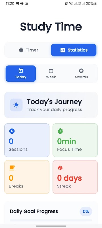 - Dagelijkse statistieken met sessietellingen en focustijd