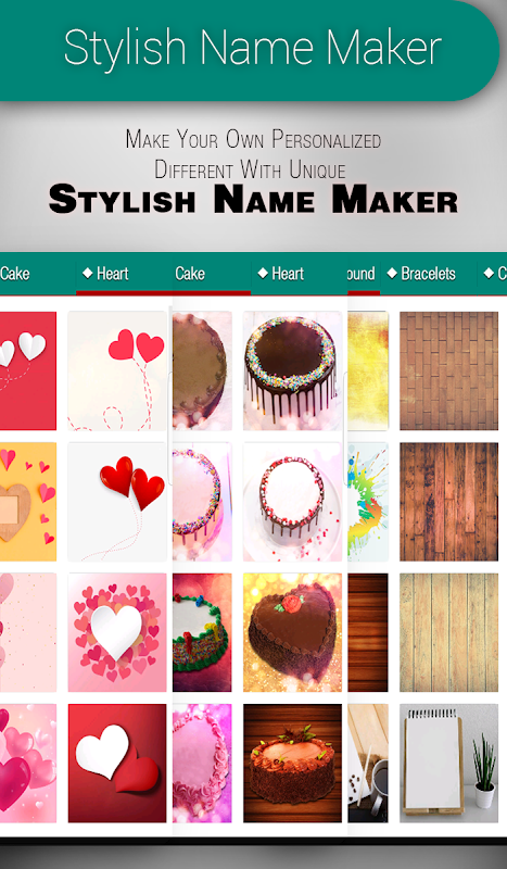 → App contains different types of backgrounds to write names on them like write name on lovely backgrounds , write name on bracelets , write name on cake , write name on heart.