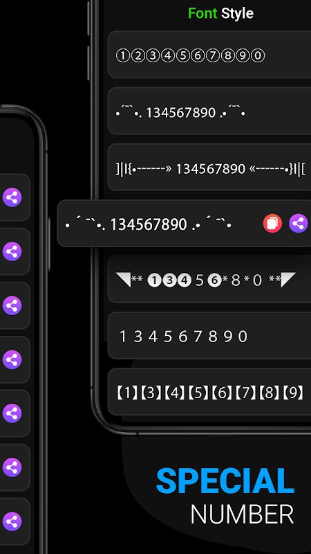 - Nummerstijlen: typ nummers zoals uw mobiele nummer of willekeurige nummers bovenaan, dan wordt het geconverteerd naar verschillende vormen, lettertypen, stijlen of formaten en verschijnt het hieronder. U kunt elk ontwerp/stijl kiezen om te verzenden of te delen.