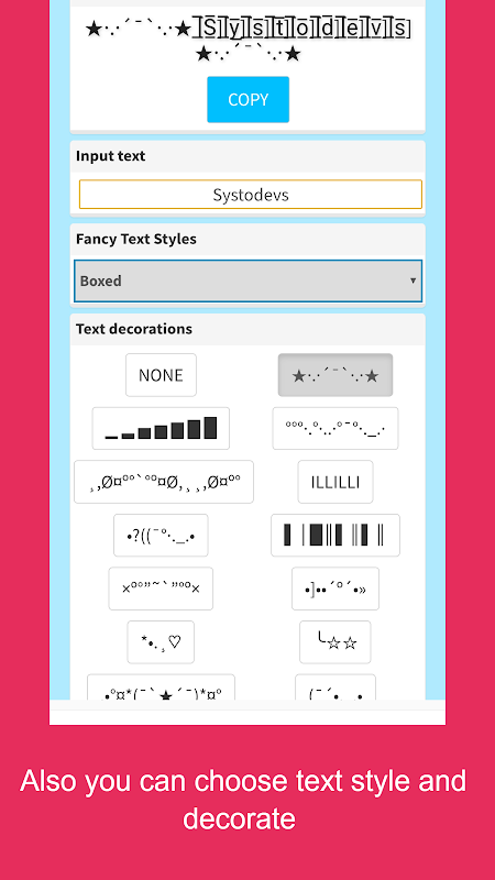 De stijlvolle tekst-app voegt een vleugje stijl toe aan uw berichten tijdens het chatten met uw vrienden door vooraf gemaakte decoratieve tekst te gebruiken.