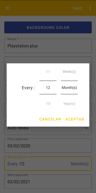 • Voeg belangrijke gegevens toe voor elk abonnement (beschrijving, het begin van de betaling, betaalmethode en opmerkingen).