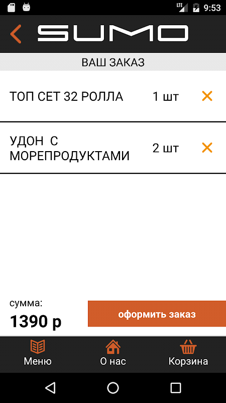 В меню ресторана "SUMO" представлены, суши, разнообразные роллы, горячие блюда, овощи и морепродукты, великолепные сеты, а также Узбекская, Европейская кухня что делает наш ассортимент большим и доступным для всех.