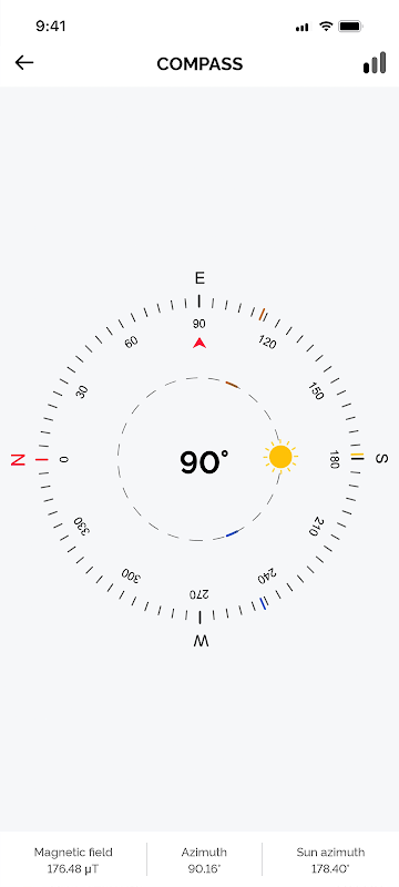 • Kaart met ingebouwd kompas om de beweging van de zon overal ter wereld te volgen.