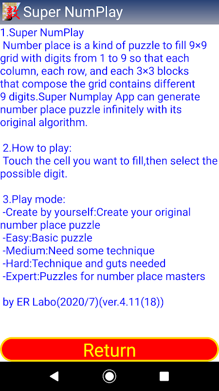 This app can be use under offline mode. With this app you can play number place puzzles unlimited anytime, anywhere, in hospital, in train, in plane.