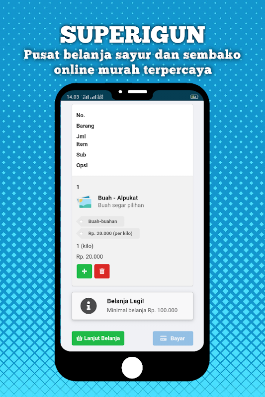 Superigun online shopping-applicatie verkoopt verse groenten en keukenbehoeften in de stad Surabaya.