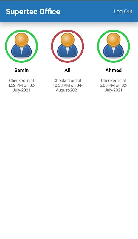 • Een beheerder logt in op zijn account en kan de status van al zijn medewerkers zien en zien of ze zijn ingecheckt.
