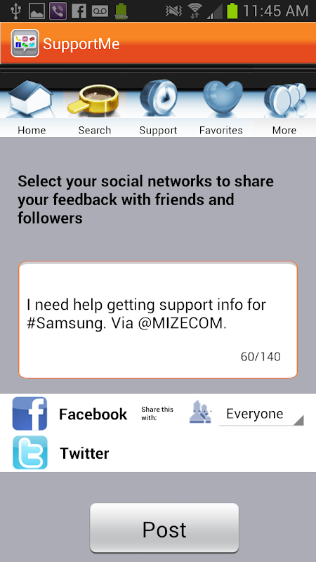 Access product support where and when you need it. Use the Support Me app from m-ize to connect to any company via phone, chat, web, email, and social networks like Facebook & Twitter. Have your voice heard; share ratings and post feedback to brands or share your experience via social media.