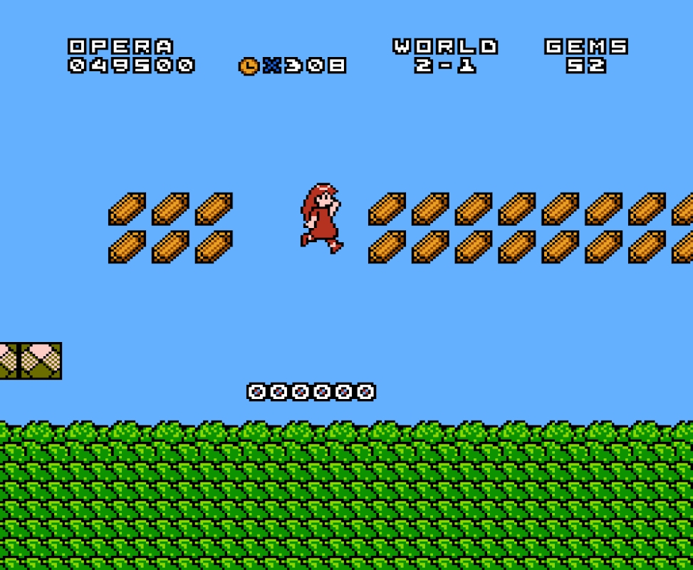 The game world features gems scattered around for Opera to collect and special bricks marked with a “S”, which when hit from below by Opera may reveal more gems or a special item. Other "secret", often invisible, bricks may contain more gems or rare items. If the player gains a heart, Opera will turn purple color. If Opera gets hit in purple color, then instead of dying she turns back to red Opera.