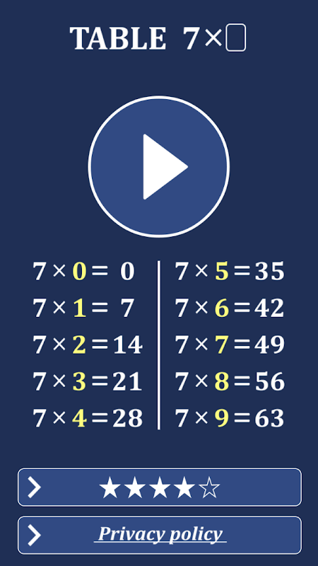 De Table7x-applicatie is gratis maar zeer effectief voor het werken en onthouden van de tafel van vermenigvuldiging met 7. Nieuw ontwerp, nieuwe spellen, nieuwe animaties. Nu biedt de Table7x-applicatie 5 spellen: