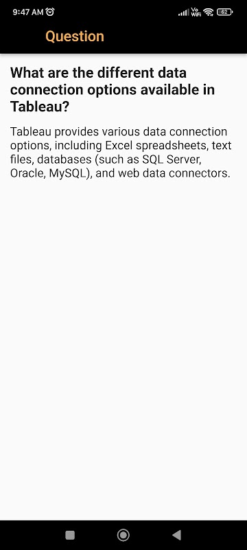 Sollicitatievragen voor Tableau: Voor degenen die specifiek geïnteresseerd zijn in Tableau, bevat onze app een speciale sectie met meer dan 100 vragen gericht op Tableau-concepten. Verdiep je kennis en vergroot je vertrouwen in interviewscenario's van Tableau.