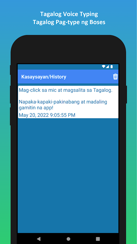 Onze ingebouwde spraakherkenningstechnologie helpt bij het omzetten van uw Tagalog-stem naar tekst. Klik gewoon op de knop 'Mic' en spreek Tagalog en onze app converteert je Tagalog-stem naar tekst! Het is EENVOUDIG om Tagalog Voice Typing te doen!!!