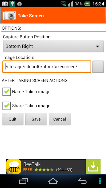 3. Configuration: You can change the configuration the app such as Overlay button position in your screen by clicking on the Take Screen item from Notification windows or long-clicking on the Overlay button.