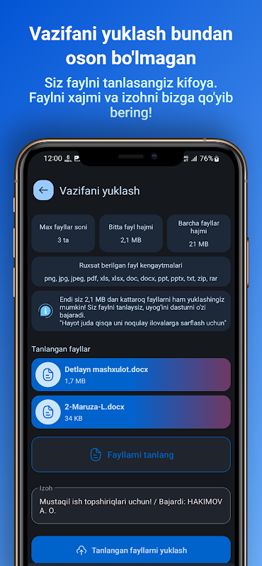 • Vazifa uchun yuklanayotgan fayl hajmini siqish — 2 MB cheklovlaridan xavotir olmang.