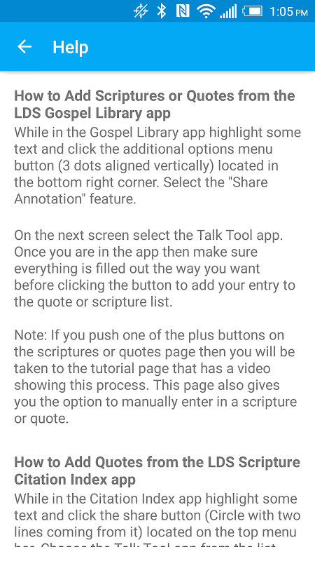 The app is integrated with the Gospel Library app so you can easily save scriptures or quotes to Talk Tool as you study the scriptures, general conference talks or lesson manuals.