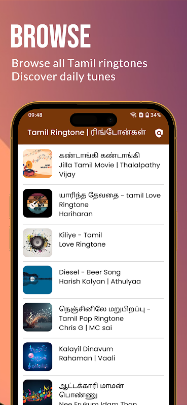 Ontdek een zorgvuldig samengestelde collectie Tamil-beltonen, waaronder melodie-achtergrondmuziek, romantische geluiden, kuthu-beats en devotionele clips om je mobiele ervaring te personaliseren.